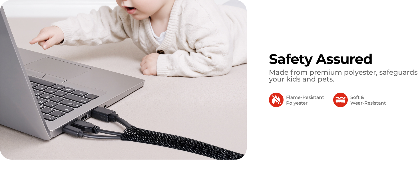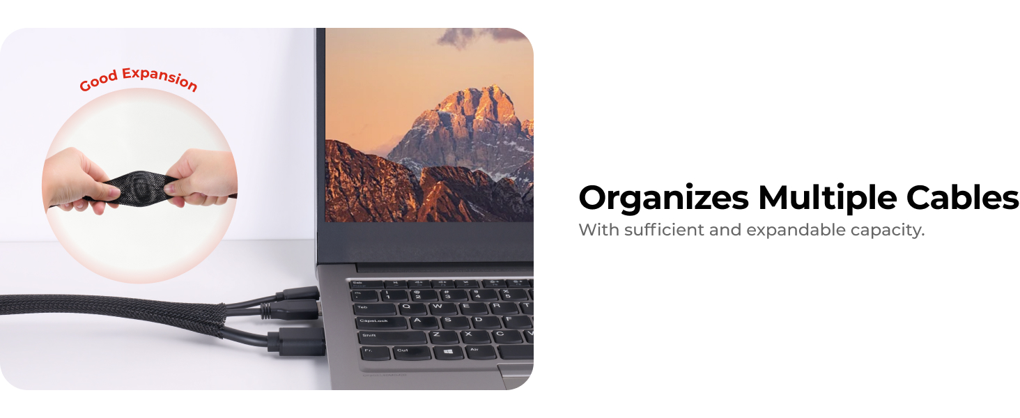 Crafted with premium-grade polyester, our braided cable organizer safely secures and unifies TV, video game and desktop computer wires - all to reduce the mess below your feet or behind your device. It can be cut to any length to match your organization needs. Additionally, it can be effortlessly assembled in minutes, and its expandable capacity easily wraps multiple cables.