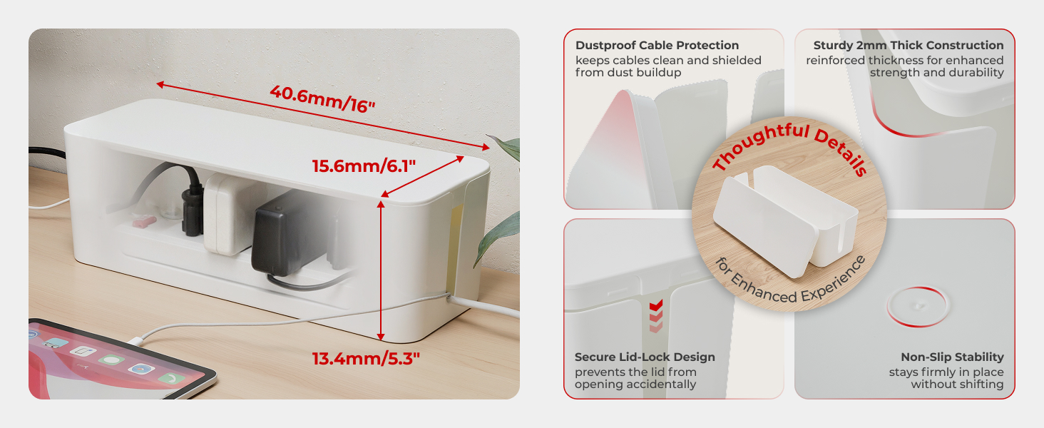 Does your power strips and cables look like a pile of spaghetti? Cable management box is a perfect storage solution for keeping your space tidy and neat. Simply drop the power strips with everything, then close the lid to hide messy cables and protect them from water and dust. Go from tangle to tidy now!