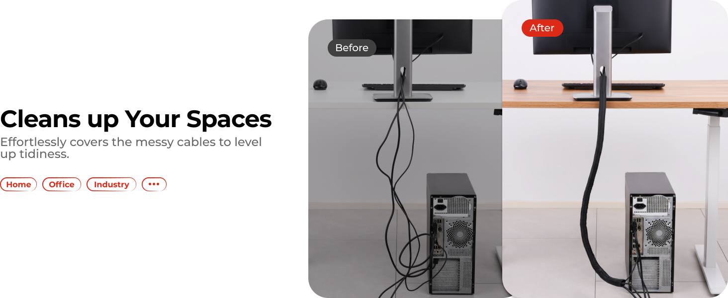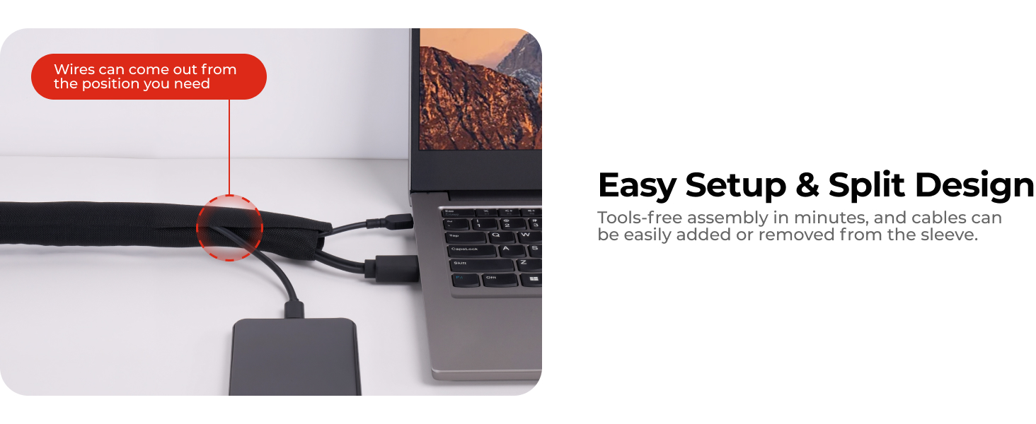 This Cable Management Sleeve is made from abrasion and flame resistant material, and it is an ideal choice for all cords. It can be cut to any length to match your organization needs. Additionally, it can be effortlessly assembled in minutes, and the split design ensures the cables come out from the position you need.