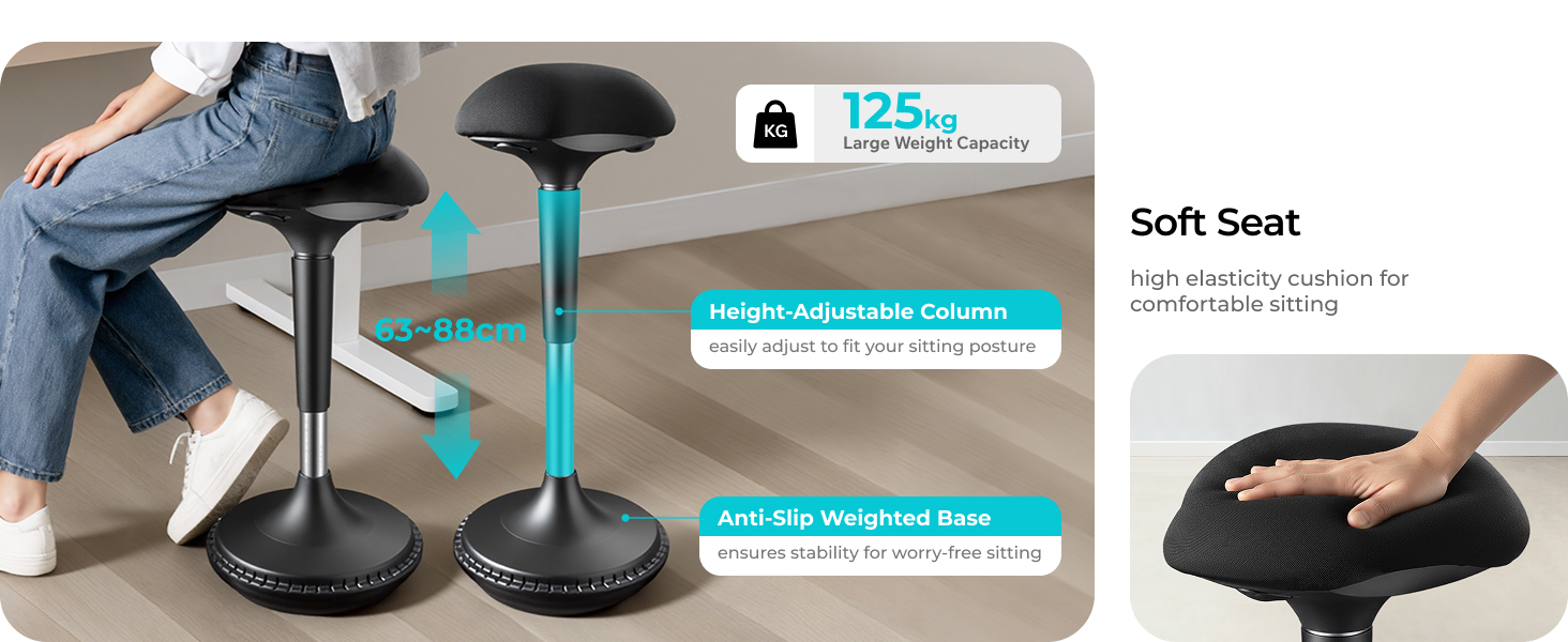 The ergonomic stool creates a dynamic, healthier, and innovative way of sitting which makes sitting more fun and enjoyable. A built-in gas spring allows you to stand up with little effort. The stool accommodates various heights while reducing fatigue and strain on legs while using a standing desk. With a tip-free base, the Wobble Stool offers the user a solid yet movable seat, guaranteed to provide you with the most modern and comfortable seat! Start wobbling today!