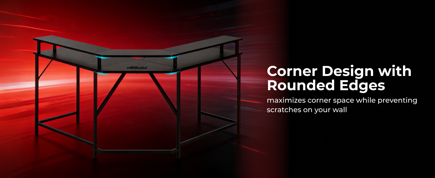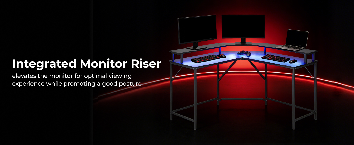 Corner-Shaped RGB Lighting Gaming Desk with Monitor Riser and Power Strip