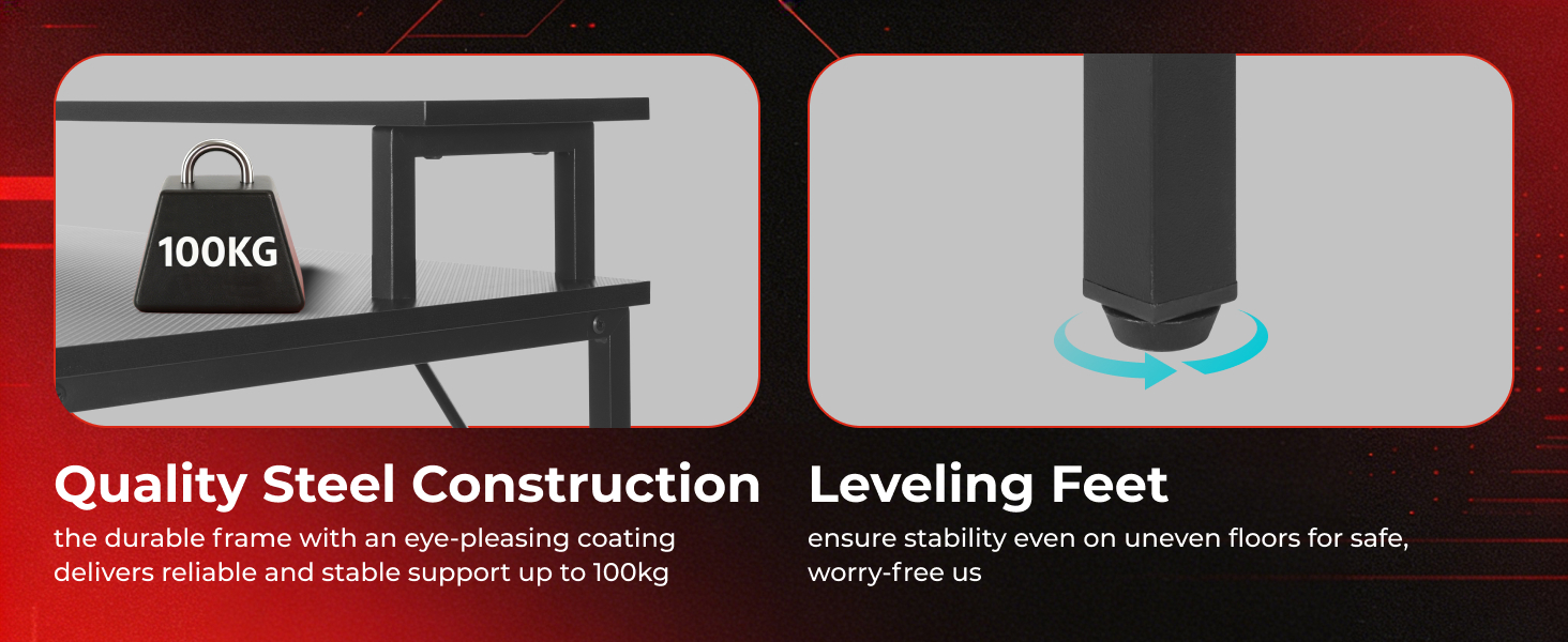 Featuring an innovative corner design, the GMD15-2 effectively utilizes corner space while providing more space for multi-tasking. The monitor riser elevates the monitor for optimal viewing experience. Multiple lighting modes create an enhanced gaming atmosphere. The leveling feet provide improved stability for any surface. Moreover, the power strip can be customized to comply with international or regional safety standards. It is a cost-effective, high-performance gaming desk that allows users to enjoy an immersive gaming experience.