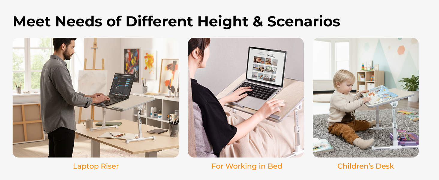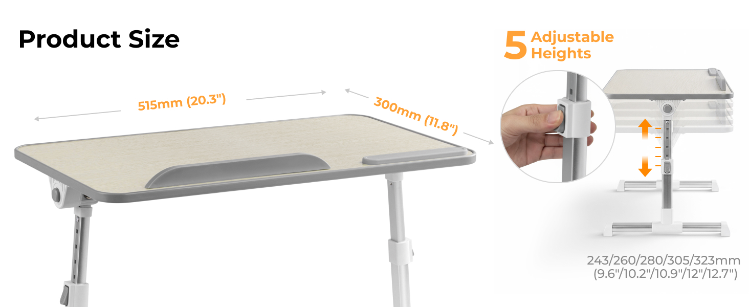 Model LPD01-6 is a Multi-Purpose Adjustable Laptop Desk which can be used as a table for bed, a laptop standing desk or a table for kids. The 5 adjustable heights and 37° tilting range accommdate to different users and meet different demands including using a laptop or reading. The upgraded snap-in buttons also allow for quicker and easier height and angle adjustment compared to most similar products incorporating knob adjustment. Last but not least, the folding design is perfect for storage-users can place it under sofa, bed, or...anywhere!
