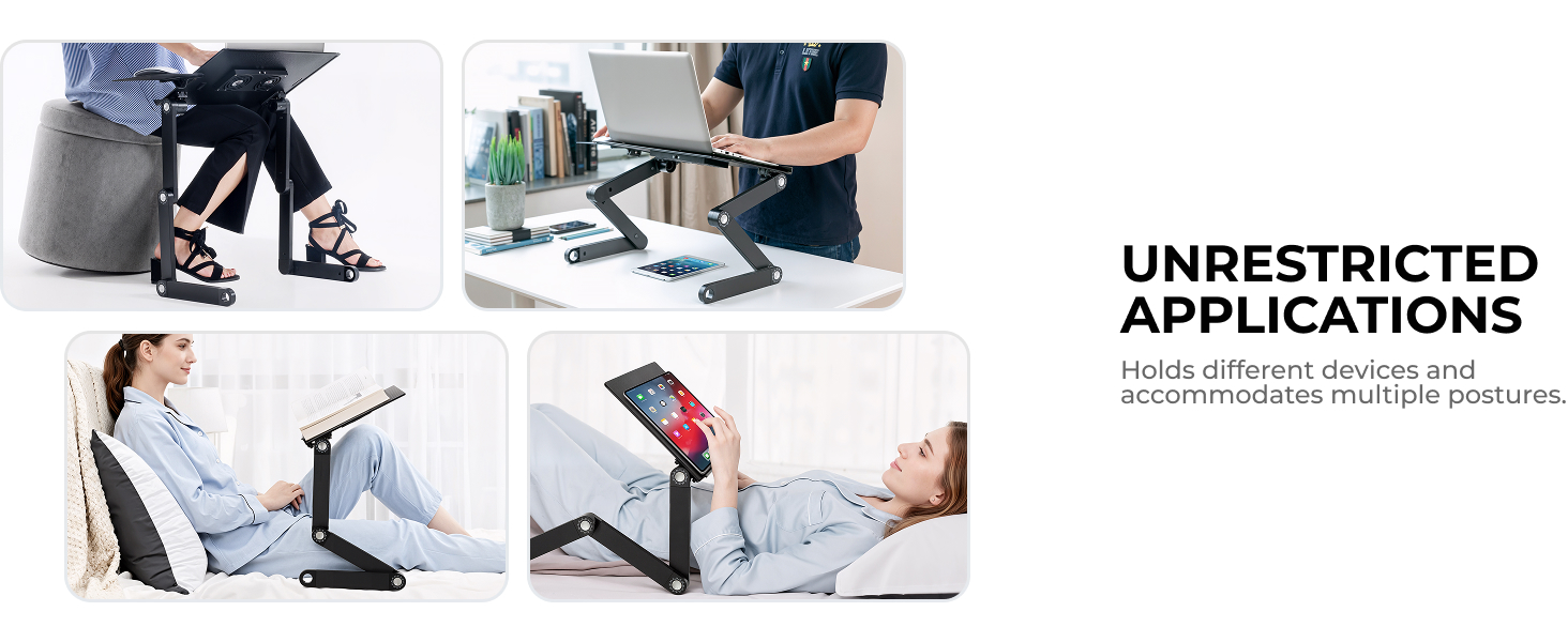 Troubled by pains after looking at laptop for a long time? No longer bend and look down at the computer when you are working on this laptop stand, develop more healthy working sitting/standing position and avoid your vision loss, good for relieve cervical lumbar fatigue and makes your work more effectively. This fully adjustable laptop desk can be folded for portability, you can carry it around. Besides, 360 °Adjustable Legs enables you to use your device at the most comfortable position, which benefits your health and helps alleviate the neck ache and shoulder pain caused by poor posture. USB cooling fan for better heat dissipation and prolong the lifetime of your device. Our laptop stand can also be used for bed/sofa lap tray, office laptop stand, a TV dinner tray, standing desk, book tray, writing desk and tablet holder.