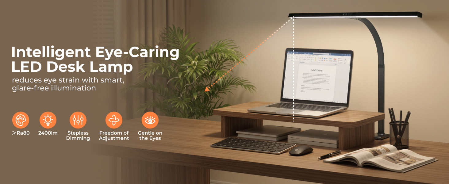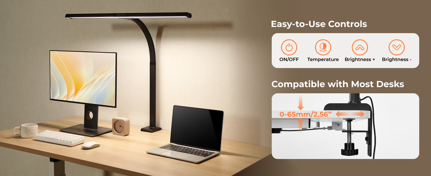 The LDL05-2E LED Desk Lamp delivers intelligent, eye-caring lighting for modern work, study, and creative spaces. With adjustable brightness and multiple color temperatures, it adapts easily to different tasks throughout the day. The wide light bar provides even, glare-free illumination, while the flexible arm allows precise positioning for optimal comfort. A sturdy clamp design ensures quick installation and saves valuable desk space, making it a practical and stylish addition to any setup.