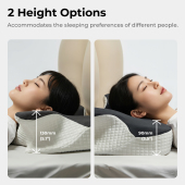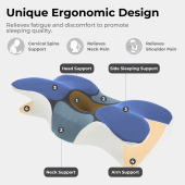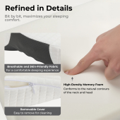 This ergonomic pillow features a multi-sectional contour design that naturally supports your head, neck, and shoulders while adapting to back, side, and stomach sleeping positions. With two height options for personalized alignment and a high-density memory foam core for lasting support, it delivers balanced comfort throughout the night. Built-in breathable air holes relieve ear pressure during side sleep and enhance airflow around the cheeks to reduce heat and help prevent acne. A removable, washable cover ensures easy cleaning and long-term freshness.