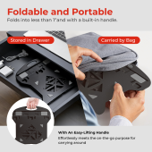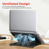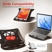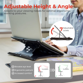 LPS02-3 Portable Laptop Stand can support up to 5kg/11 lbs, perfect for 11”-15” laptops, tablets, books and more.7 level angle and height adjustment allows comfort viewing and improves posture over long hours working on the notebook. It has 360° swivel base which makes it easy to share your screen and quickly change viewing angles. Anti-slip pads and anti-skid baffles holds your device firmly while typing or reading. Thanks to its foldable and portable design, the laptop riser is 0.79” in thick when folded and with handle for easy carrying.