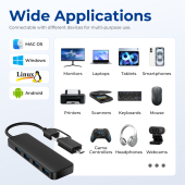 Upgrade your connectivity with this compact 4-in-1 USB 3.0 Hub, featuring four USB-A 3.0 ports for effortless expansion. Designed with a flexible USB-A & USB-C input connector, it works seamlessly with laptops, tablets, and more. Enjoy high-speed USB 3.0 performance for fast data transfer, backed by a stable, durable build for reliable daily use. Small in size but powerful in function, it fits multiple devices while keeping your workspace clean and organized.