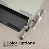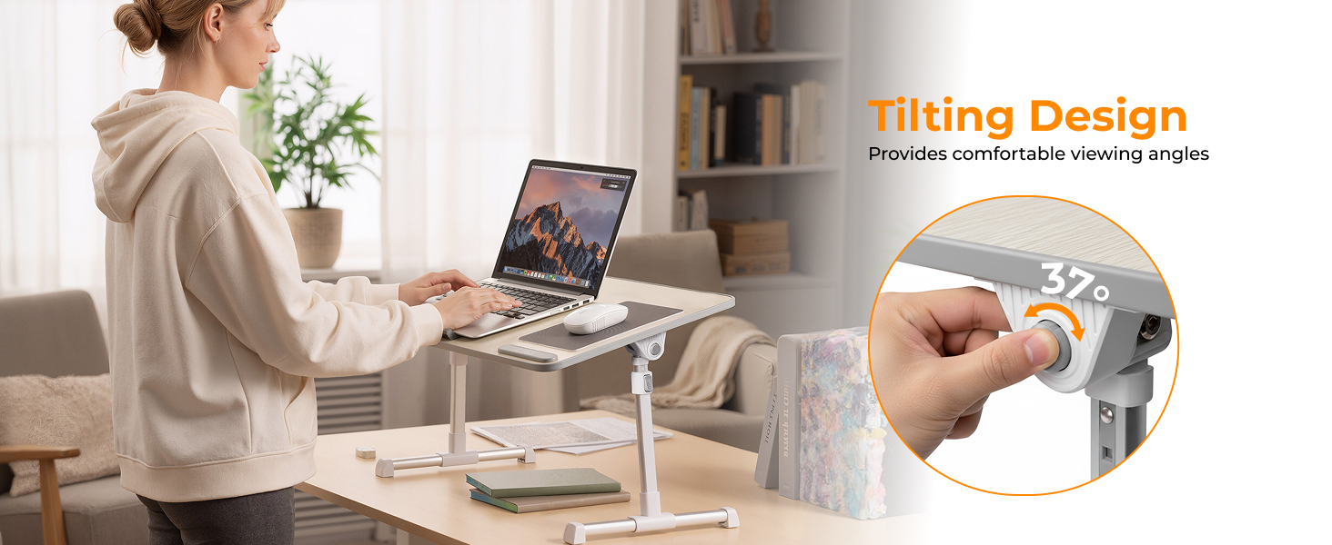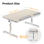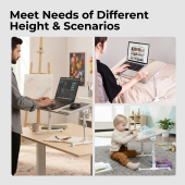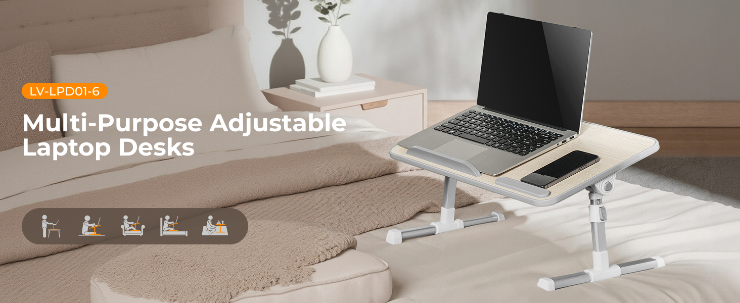 Model LPD01-6 is a Multi-Purpose Adjustable Laptop Desk which can be used as a table for bed, a laptop standing desk or a table for kids. The 5 adjustable heights and 37° tilting range accommdate to different users and meet different demands including using a laptop or reading. The upgraded snap-in buttons also allow for quicker and easier height and angle adjustment compared to most similar products incorporating knob adjustment. Last but not least, the folding design is perfect for storage-users can place it under sofa, bed, or...anywhere!