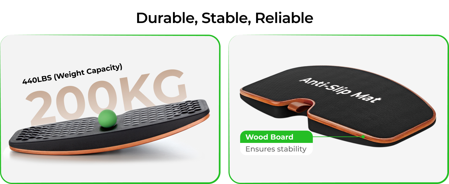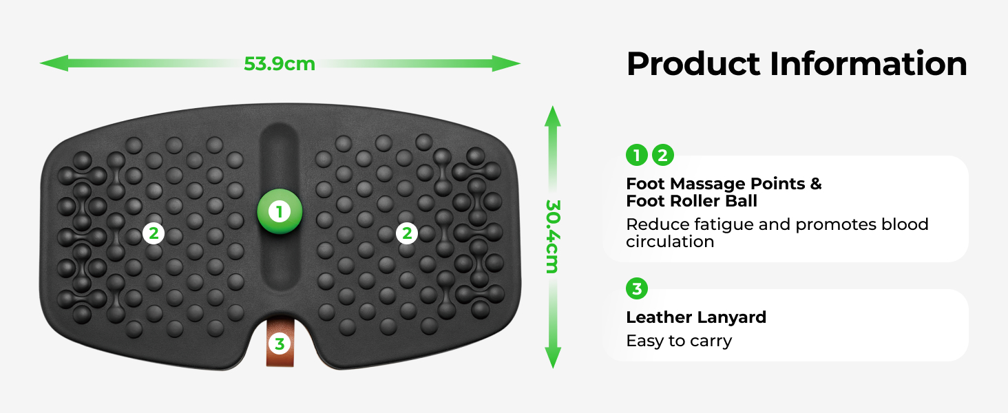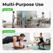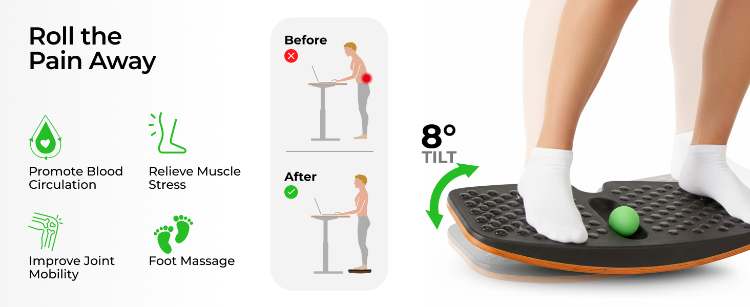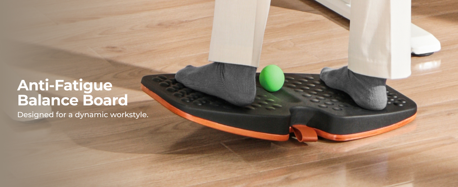 Designed for a dynamic workstyle, the balance board creates a low-impact rocking motion that keeps the user's body constantly engaged while working, no matter the legs, back, or core muscles. It encourages the body in a comfortable, natural position, reducing the negative effects of a static workstyle. Built with 3-layered premium materials, the balance board is durable and sturdy enough to hold up to 200kg/440lbs. It features a foot massage to reduce fatigue and improve blood circulation. With a leather lanyard, it is convenient to carry or hang it on the hook of the standing desk.
