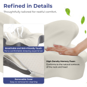 This ergonomic pillow features a multi-sectional contour design that naturally supports your head, neck, and shoulders while adapting to back, side, and stomach sleeping positions. With two height options for personalized alignment and a high-density memory foam core for lasting support, it delivers balanced comfort throughout the night. A removable, washable cover ensures easy cleaning and long-term freshness.